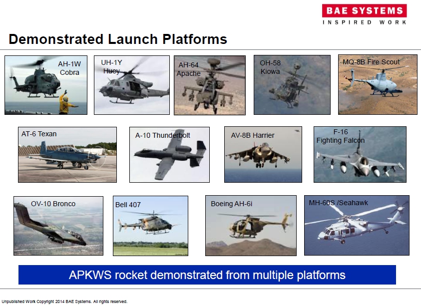 “Right now it’s the only government program of record for 70 mm in the US DoD. It was deployed in the United States Marine Corps in 2012 where it received its initial operating capability. We’ve had over 500 shots of APKWS and over 200 of those have been in combat with the United States Marine Corps. It was originally deployed with the Marines on the AH-1 Cobras and the UH-1s and we sell those through the United States Navy to the United States Marine Corps.We’ve fired it off more than twelve platforms. Those include fixed wing and rotary wing.