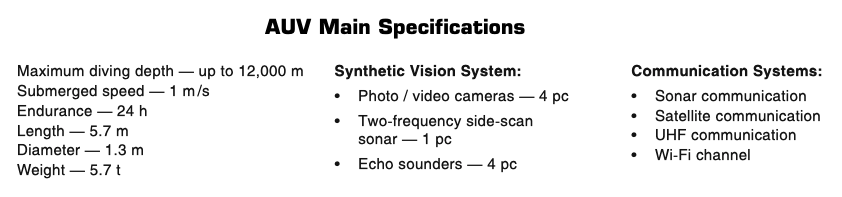Specifications of the Vityaz Autonomous Unmanned Underwater Vehicle for Ultradeep Diving | Source: Rubin Design Bureau