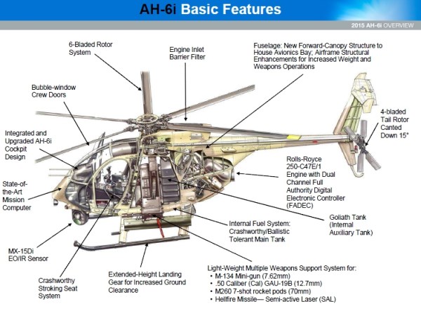 The AH-6 derives 89 percent of its software from the AH-64 and incorporates a four-bladed Apache tail rotor and a six-bladed main rotor, and a fully-integrated glass cockpit. In terms of crashworthiness, the seat on the AH-6 is rated to almost 30Gs and all the fuel tanks are ballistic-tolerant against .50 calibre munition, with a separable main tank and self-sealing auxiliary tank.