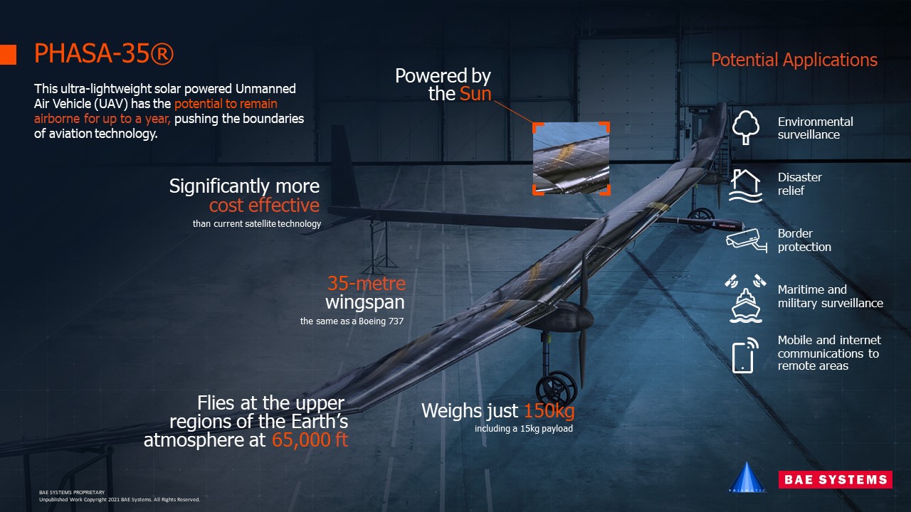 And for the first time, the company will demonstrate the capabilities of the PHASA-35, ‘an ultra-light weight, solar-electric High Altitude Long Endurance (HALE) Unmanned Aerial System (UAS) platform’.