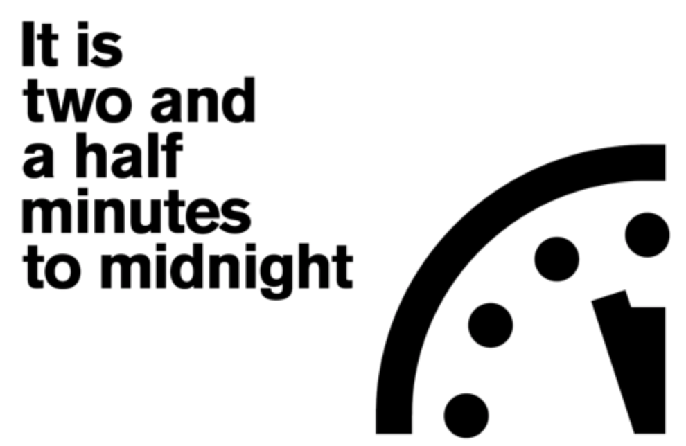 The Bulletin of the Atomic Scientists' Doomsday Clock has only been closer to midnight once before, after the U.S. and U.S.S.R. tested hydrogen bombs in 1953.