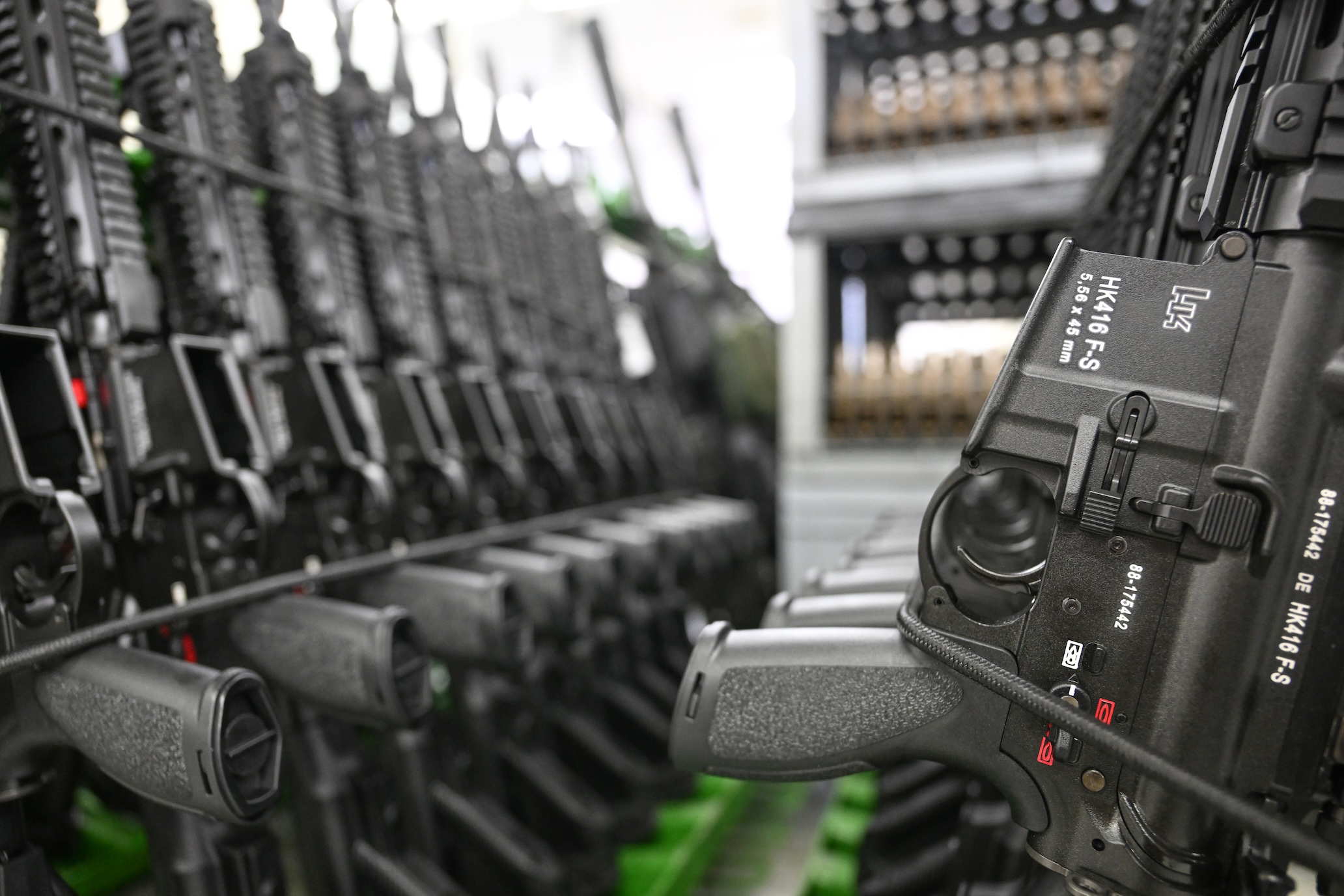 Finished HK416 assault rifles are lined up in the production hall of arms manufacturer Heckler & Koch in Oberndorf. German arms exports have reached a new record level for the second year in a row, mostly due to continued and growing military aid for Ukraine, according to the Economy Ministry. | – Photo: Bernd Weiflbrod/dpa/28 February 2022, Baden-Wuerttemberg, Oberndorf