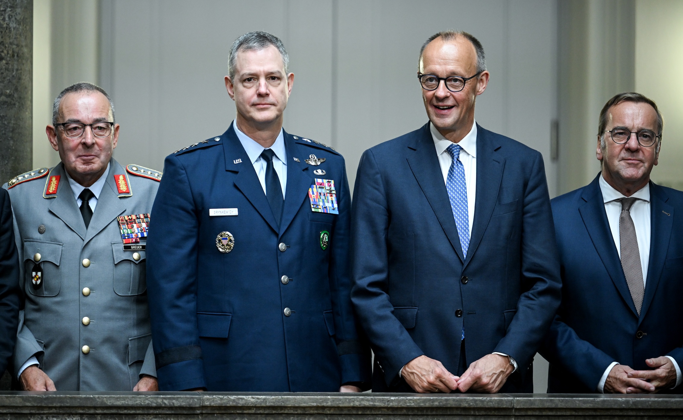 (L-R) Inspector General Carsten Breuer, U.S. Lieutenant General Alexus Grynkewich, Chancellor Friedrich Merz, and Defence Minister Boris Pistorius talk at the start of the 14th cabinet meeting of the 21st legislative period at the Bendlerblock in the German Defence Ministry | Photo: Britta Pedersen/dpa