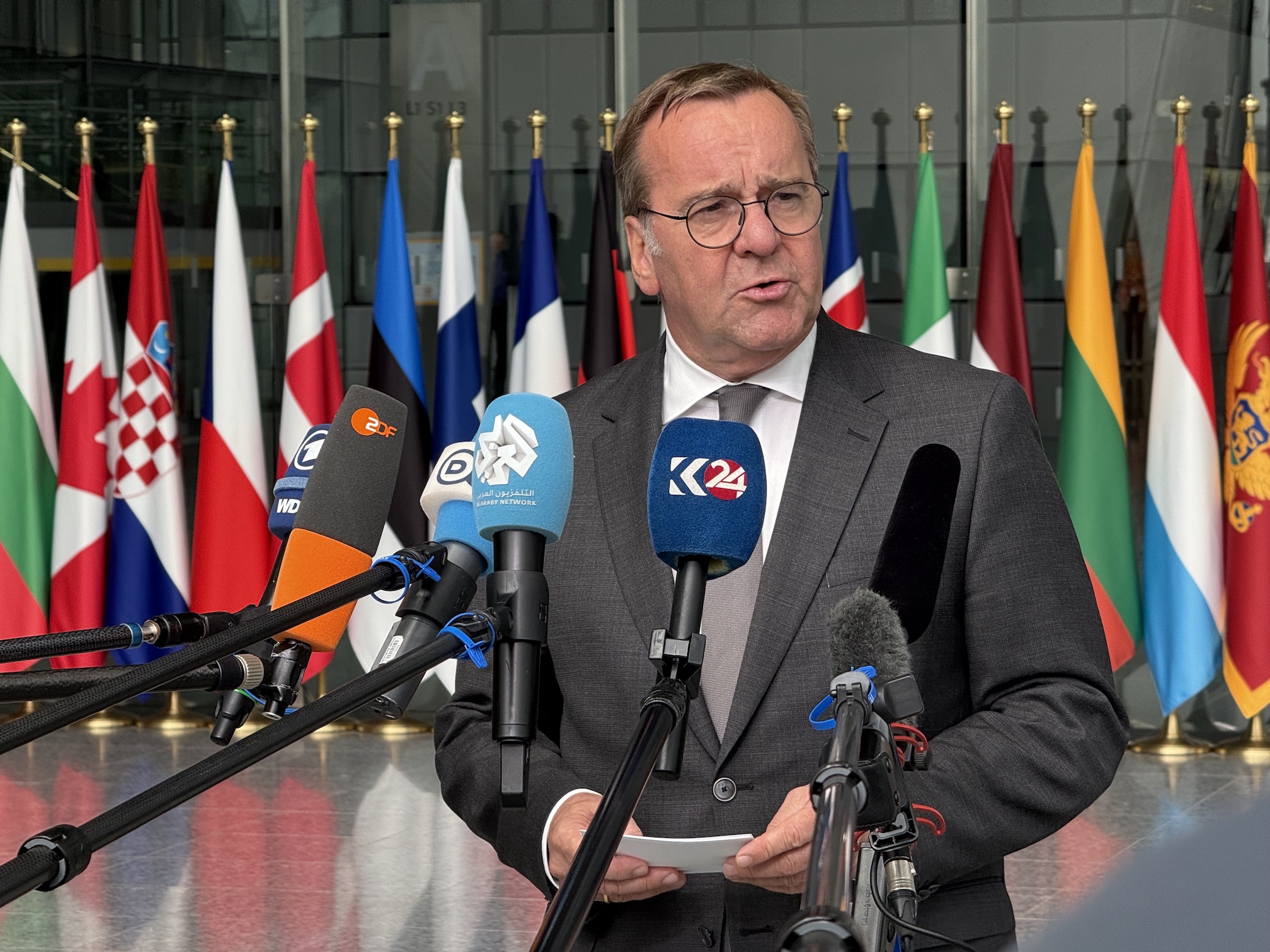 German Defence Minister Boris Pistorius gives a press statement before the meeting of the International Contact Group (UDCG) to coordinate military support for Ukraine at NATO headquarters | Photo: Helena Dolderer/dpa