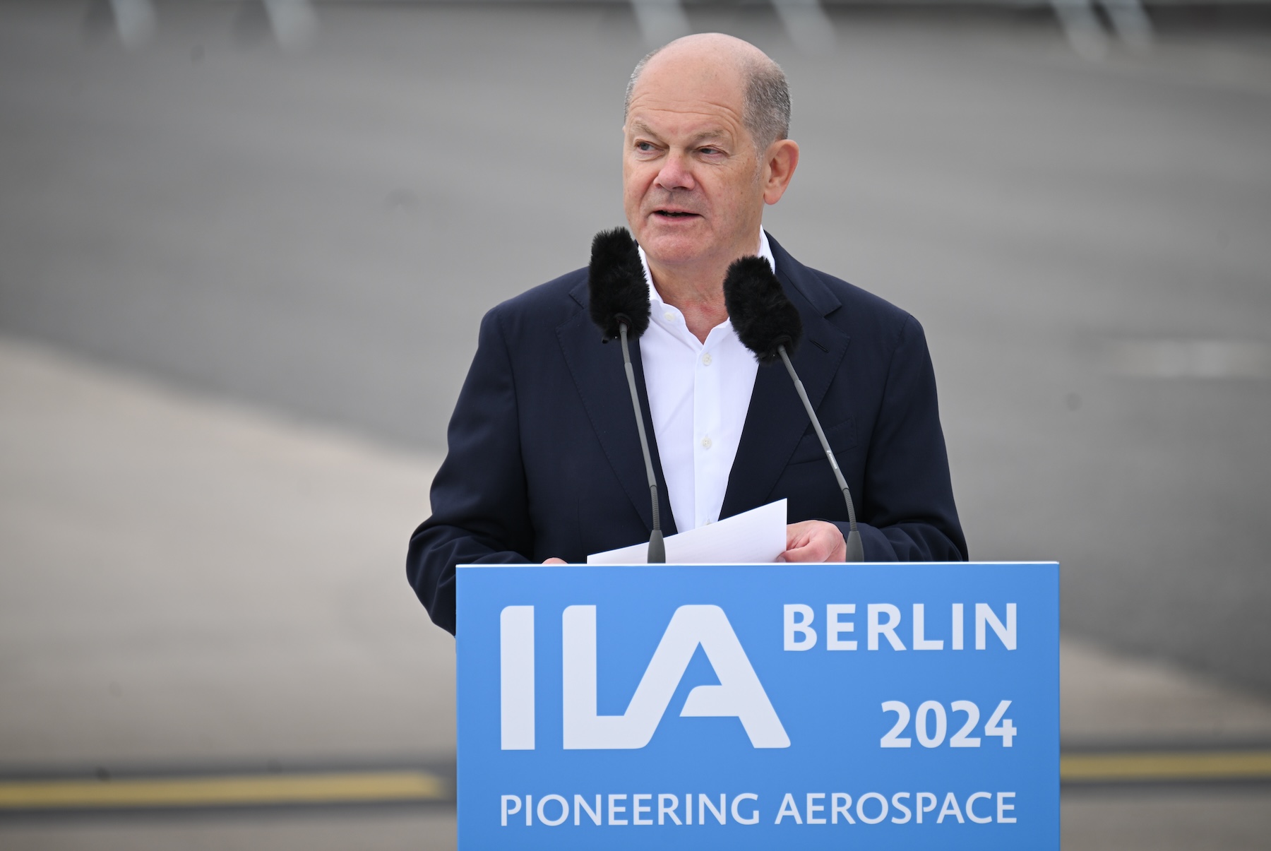 05 June 2024, Brandenburg, Schoenefeld: Germany’s Chancellor Olaf Scholz speaks during the opening tour of the International Aerospace Exhibition (ILA) on the grounds of Berlin Brandenburg Airport (BER) | Photo: Sebastian Christoph Gollnow/dpa