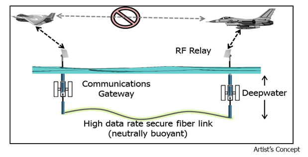 The concept involves deploying RF network node buoys—dropped from aircraft or ships, for example—that would be connected via thin underwater fiber-optic cables. The very-small-diameter fiber-optic cables being developed are designed to last 30 days in the rough ocean environment—long enough to provide essential connectivity until primary methods of communications are restored.