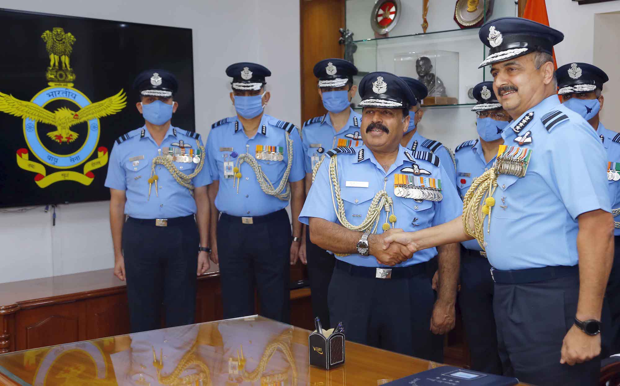 Outgoing Chief of Air Staff of the Indian Air Force, Air Chief Marshal R.K.S. Bhadauria with his successor, Air Chief Marshal V.R. Chaudhari on Thursday | Photo: Indian Air Force