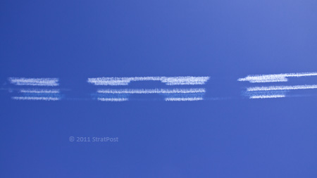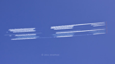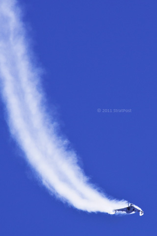 - The Indian Air Force (IAF) Surya Kiran aerobatics team, sky-writing at Aero India 2011. Photo: Shashank Nanda/StratPost