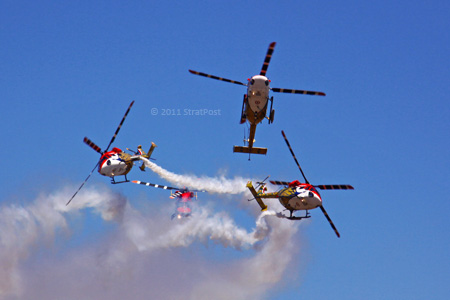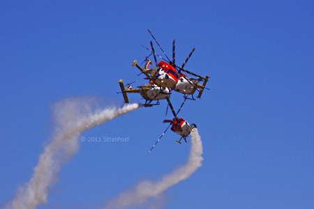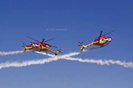 - The Indian Air Force Dhruv Advanced Light Helicopter (ALH) aerobatics display team at Aero India 2011. Photo: Shashank Nanda/StratPost