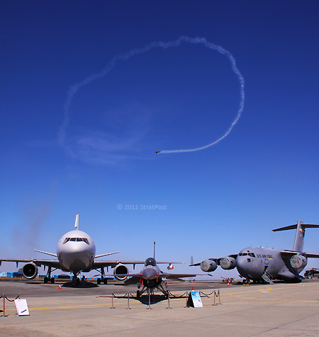 - A McDonnell Douglas KC-10 Extender, a US Air Force F-16 and a C-17 Globemaster III. Photo: Shashank Nanda/StratPost