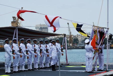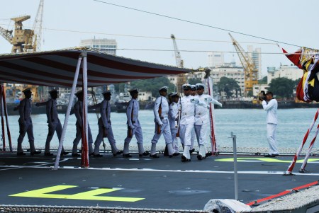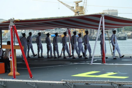 - The crew of the Satpura wait for the Commissioning ceremony.