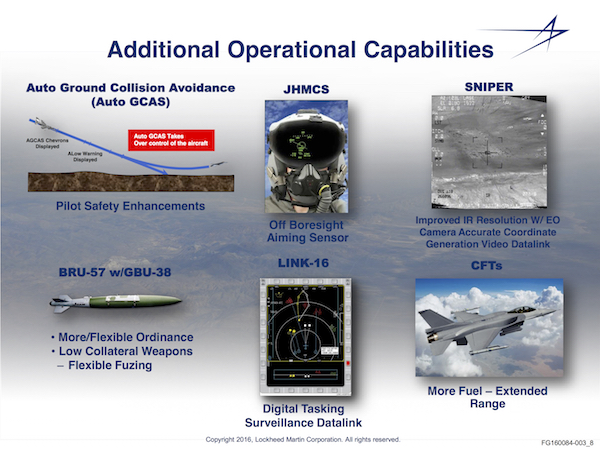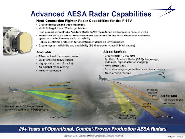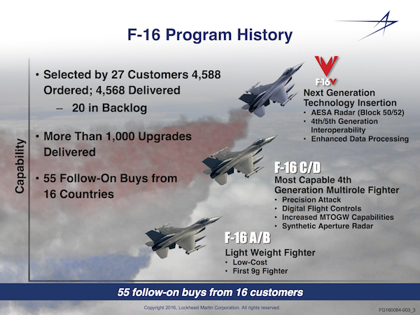 Calling the F-16V a ‘natural evolution of a proven Mid Life Update program and a Common Configuration Improvement Program’, Howard said, “What we are doing with the F-16 is taking all of what we’ve learned from the F-35 and F-22 and what really represents 100 billion dollars in investment by the United States and fielding those capabilities taking those technologies off of them and reinserting them into the F-16 to make it so much more relevant for the future.”Listing capabilities like Active Electronically Scanned Array (AESA) radar and Automatic Ground Collision Avoidance System (Auto GCAS), Howard said, “It’s the next iteration of upgrades, so we’re taking technologies that are on our latest fifth generation airplanes – Lockheed Martin being the only fighter aircraft manufacturer that has designed manufactured and fielded operational fifth generation fighter airplanes – we’re taking those technologies to the extent that we can and we’re rolling them back into the F-16,” he added.