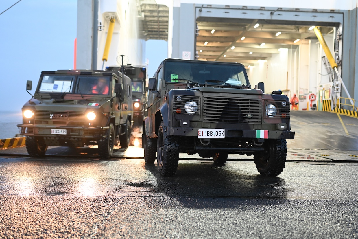 Dozens of vehicles belonging to an Italian military unit rolled off a cargo ship at the north-western German port of Emden early on Thursday.