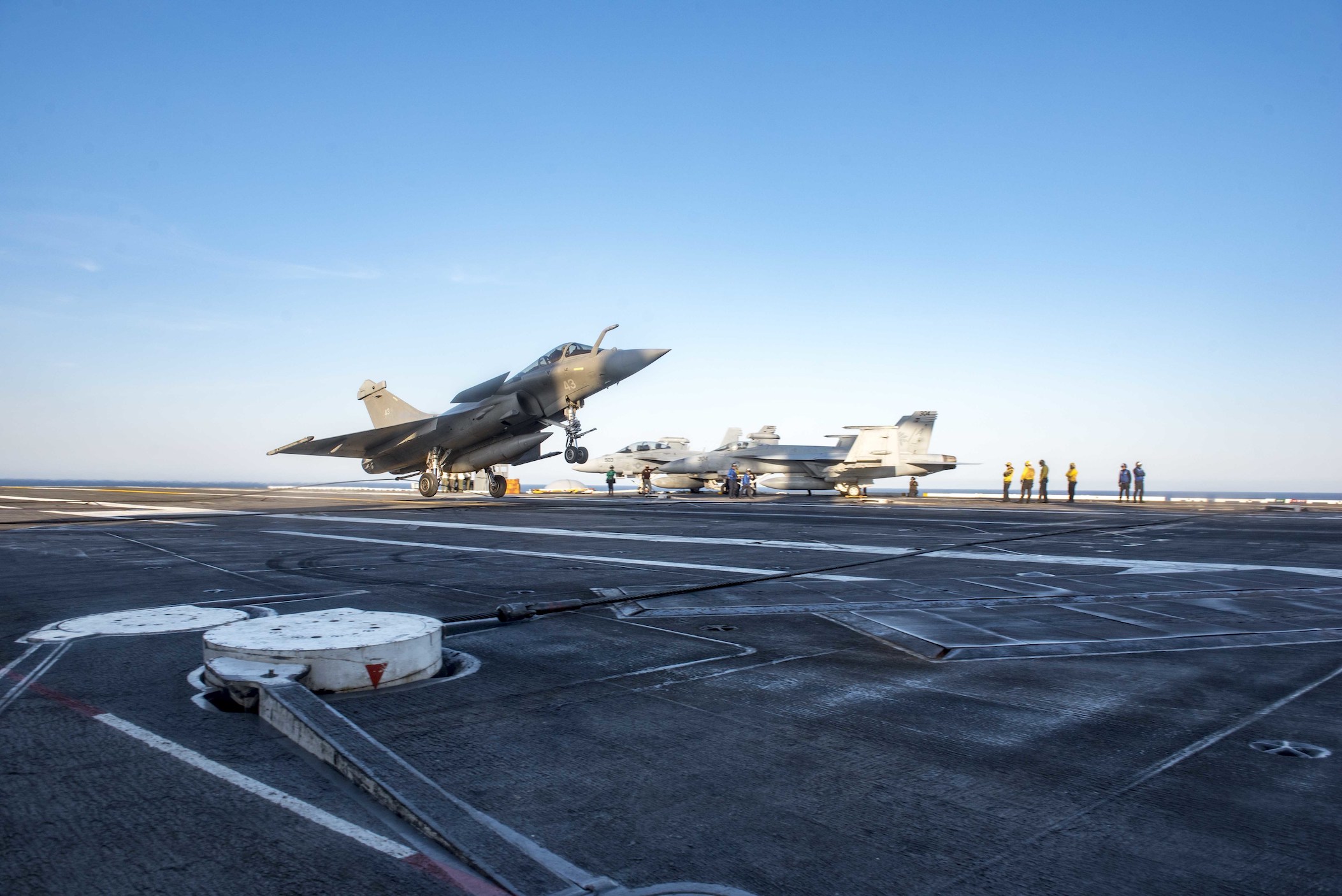 A Rafale Marine attached to Squadron 17F of the French Navy lands on the flight deck of the aircraft carrier USS George H.W. Bush (CVN 77) in the Atlantic Ocean on May 10, 2018 | U.S. Navy photo by Mass Communication Specialist 2nd Class David Mora Jr.