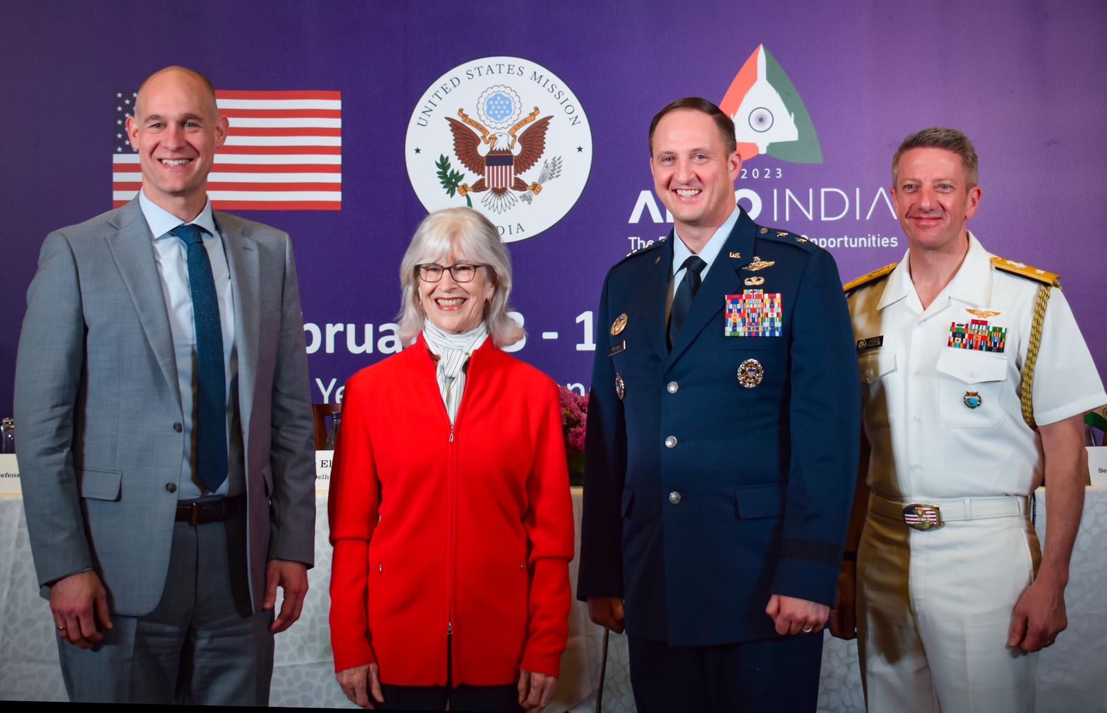 Principal Deputy Assistant Secretary of Defense for Indo-Pacific Security Affairs Jedidiah P. Royal, U.S. Embassy New Delhi Chargé d’Affaires, a.i. Ambassador A. Elizabeth Jones, Major General Julian C. Cheater, Assistant Deputy Under Secretary of the Air Force, International Affairs, and Senior Defense Official and Defense Attaché Rear Admiral Michael Baker at a press conference in Bengaluru on the U.S. participation at Aero India 2023 | Photo: U.S. Embassy, New Delhi