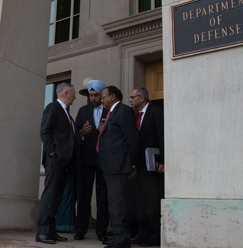 Defense Secretary Jim Mattis speaks with India’s National Security Advisor Ajit Kumar Doval before a meeting at the Pentagon, March 24, 2017 | DOD photo by Army Sgt. Amber I. Smith
