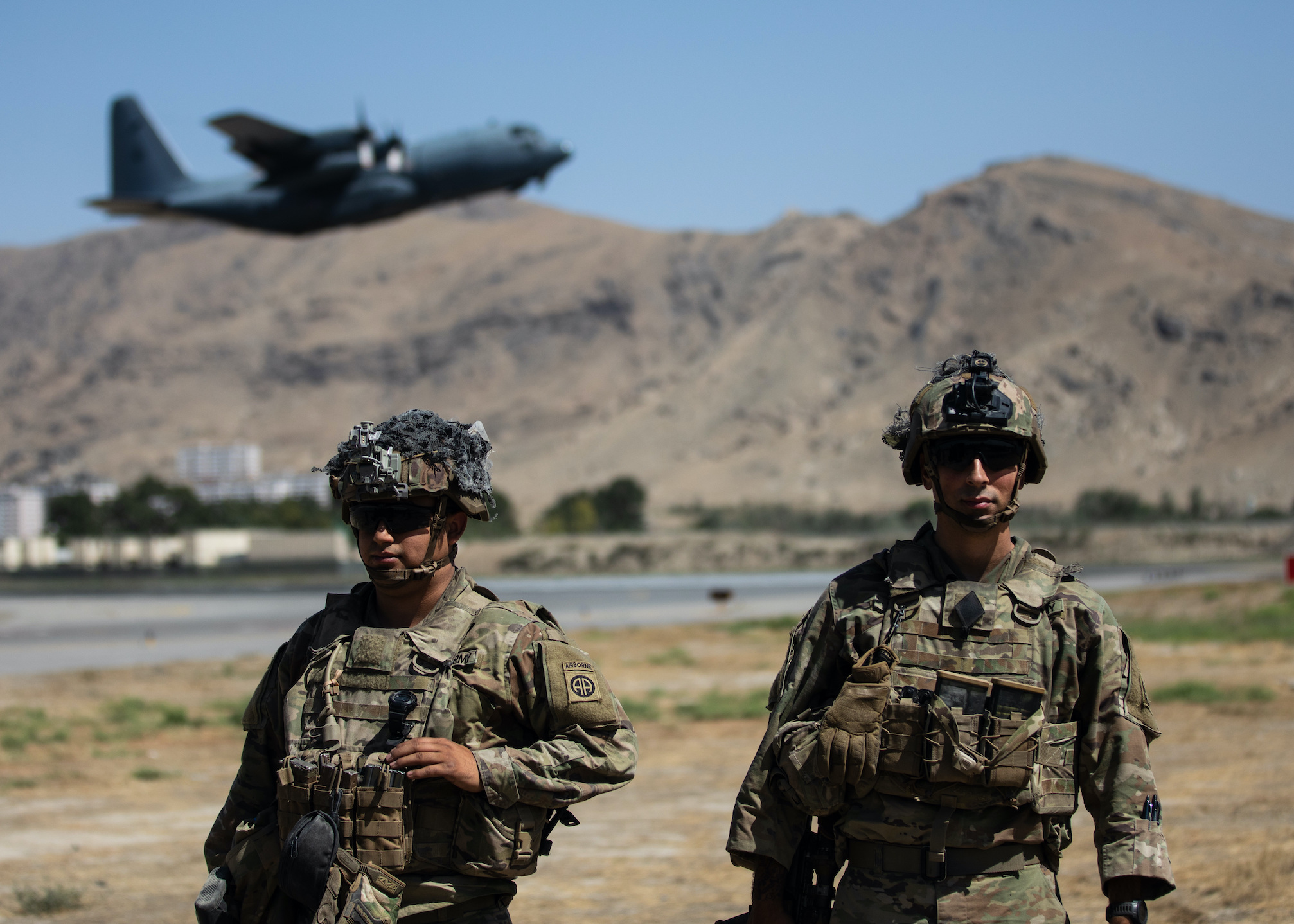Two paratroopers assigned to the 1st Brigade Combat Team, 82nd Airborne Division conduct security while a C-130 Hercules takes off during a non-combatant evacuation operation in Kabul, Afghanistan on August 25, 2021 | Photo: U.S. Central Command/ Master Sgt. Alexander Burnett
